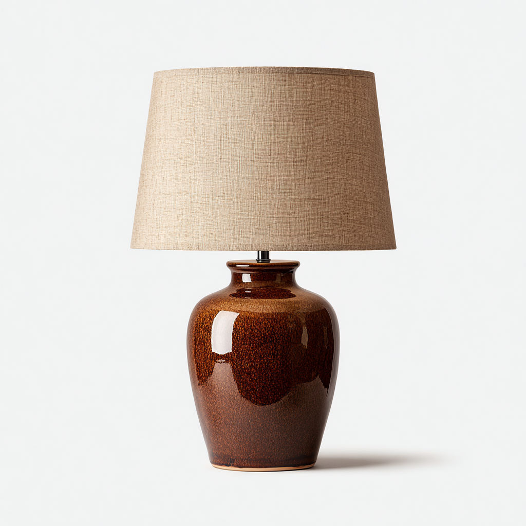 Esta lámpara de mesa presenta una base de cerámica en tono marrón con acabado brillante y una pantalla textil beige, ofreciendo una iluminación cálida adecuada para salón y dormitorio. Su diseño clásico aporta un estilo elegante a diversos ambientes interiores.